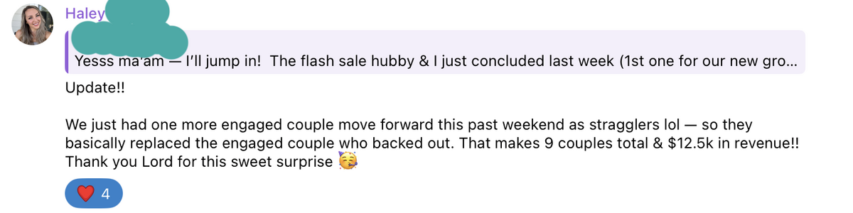 Joining Ashley June's Selah Collective was a game-changer for me. I came to Ashley with a testimony and idea and she helped me fully map out my signature framework and structure for my coaching program. Her insight on storytelling also led to a significant Instagram following boost as I shared my story—6k new followers, to be exact. Some of those followers became clients when I launched my beta program. I enrolled six students and generated $4k in revenue. This marks the highest profit in my business so far. I'm excited to see the outcome of my first official launch with Ashley's help.