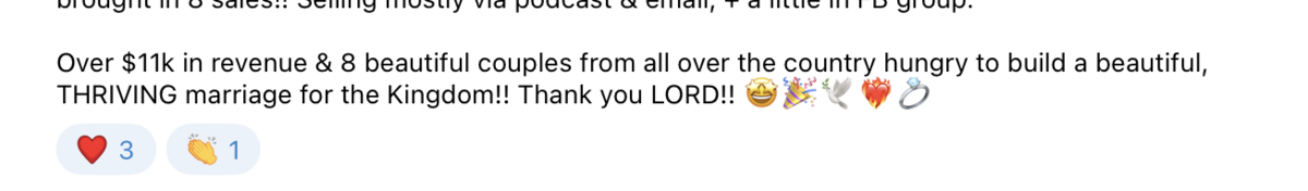 It has been almost one year since I first launched my Signature coaching program following Ashley’s advice and teachings. The launch itself was an incredible experience, and having Ashley in my corner helped me to organize all the pieces as I went through the launch so that the next round I would be even more prepared. Which I was! That second round was a piece of cake with all my posts and email sequences already written and ready to schedule out. There was definitely work that came afterward with delivering weekly coaching to my new clients while also finishing actual course materials. And I was SO thankful for the supportive sisters I met inside the Selah collective during this time. We still work together every two weeks to help each other through things, give feedback, and pray for each other. Year to date, I have done two official launches, making $3,494 the first and $5494 from the second. I have also enrolled women in between these launches and in partnership with a couple bootcamps and masterclasses I now cycle through, I made over $30,000 last year and I’m excited to report that now 5K months has become my norm. As a busy, homeschooling mompreneur, I now make more than I made when I was in the workforce with my degree! I’m so thankful for Ashley and this community and highly recommend the Selah Collective to help you get started and launch into your next level.